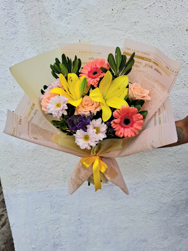 Hermoso mini bouquet con lilis, rosas y gerberas ideal si quieres enviar un lindo detalle.
